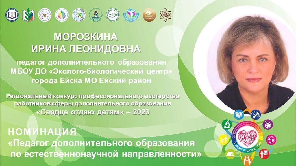 - МБОУ ДО ЭБЦ г. Ейска МО Ейский район – Морозкина Ирина Леонидовна – победитель в номинации «Педагог дополнительного образования по естественнонаучной направленности» в 1 заочном этапе; лауреат 2 степени в очном этапе конкурса.
