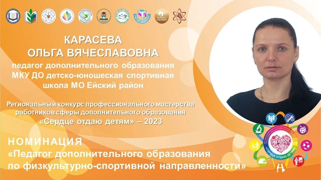 - МКУ ДО ДЮСШ МО Ейский район – Карасёва Ольга Вячеславовна – победитель в номинации «Педагог дополнительного образования физкультурно – спортивной направленности» в 1 заочном этапе; дипломант в очном этапе конкурса