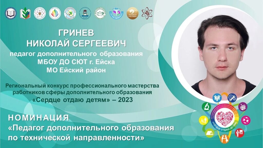 - МБОУ ДО СЮТ г Ейска МО Ейский район – Гринёв Николай Сергеевич – победитель в номинации «Педагог дополнительного образования по технической направленности» в 1 заочном этапе; лауреат 2 степени в очном этапе конкурса.