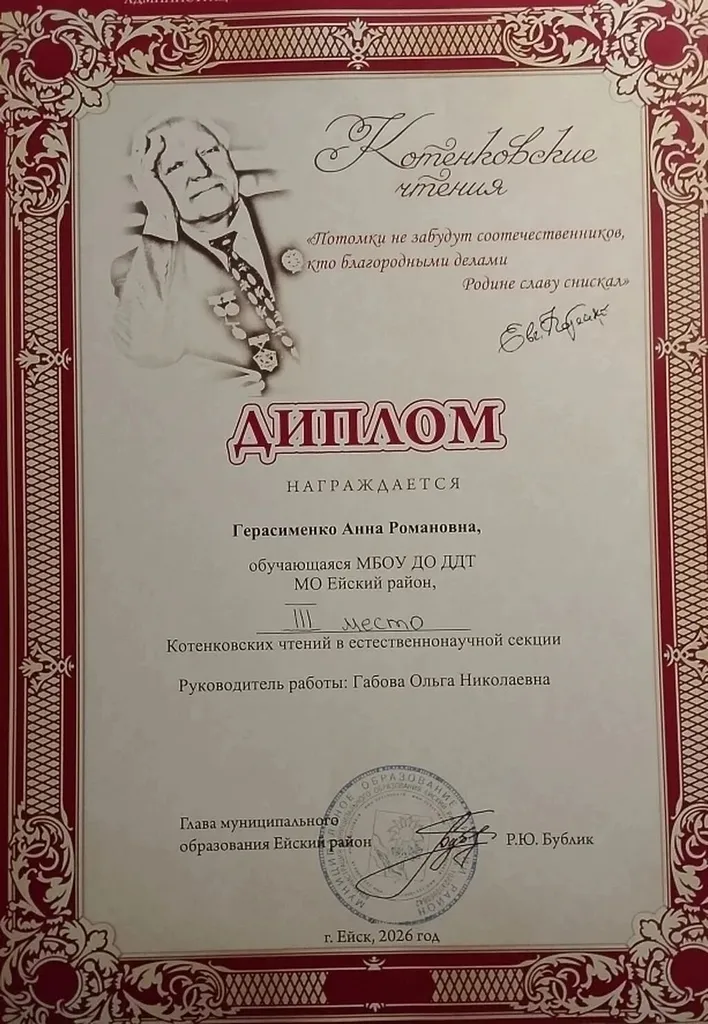 МБОУ ДО ДДТ МО Ейский район (творческое объединение "Научное общество учащихся") представляла Герасименко Анна, ученица Ясенской школы N21.