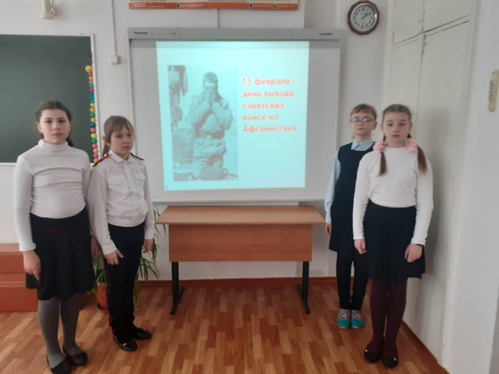 15 февраля 2021 года в МБОУ ДО ДДТ ОДО МБОУ СОШ 8 ст. Копанская МО Ейский район с учащимися объединений "Малинки" и "Восторг" (руководители: Герасименко С. В. и Левадняя Н. И, в рамках оборонно-массовой и военно-патриотической работы прошло мероприятие "Чтобы не забыть - надо помнить! ", посвящённое 32 - годовщине вывода советских войск из Афганистана. У каждого народа есть славные воинские победы, память, о которых передаётся из поколения в поколение. На таких победах воспитывается дух нации, гордость за величие предков. Русский народ с благодарностью хранит память об этих воинских победах, о полководцах и воинах, прославивших себя, защищая народ и Отечество.