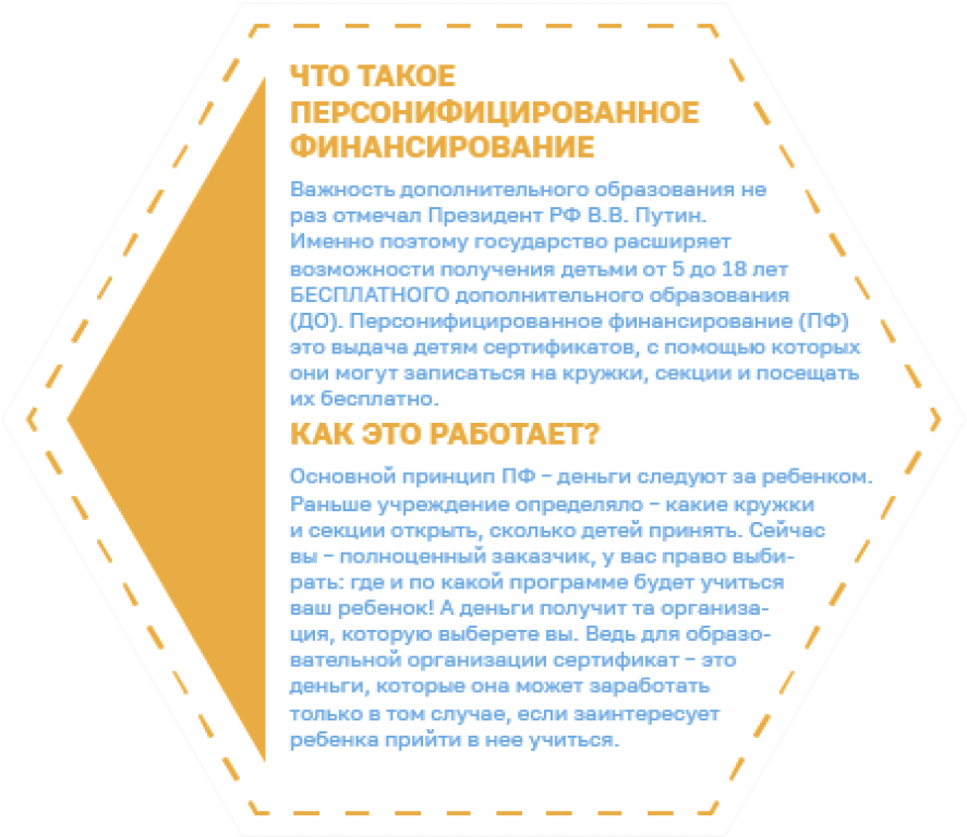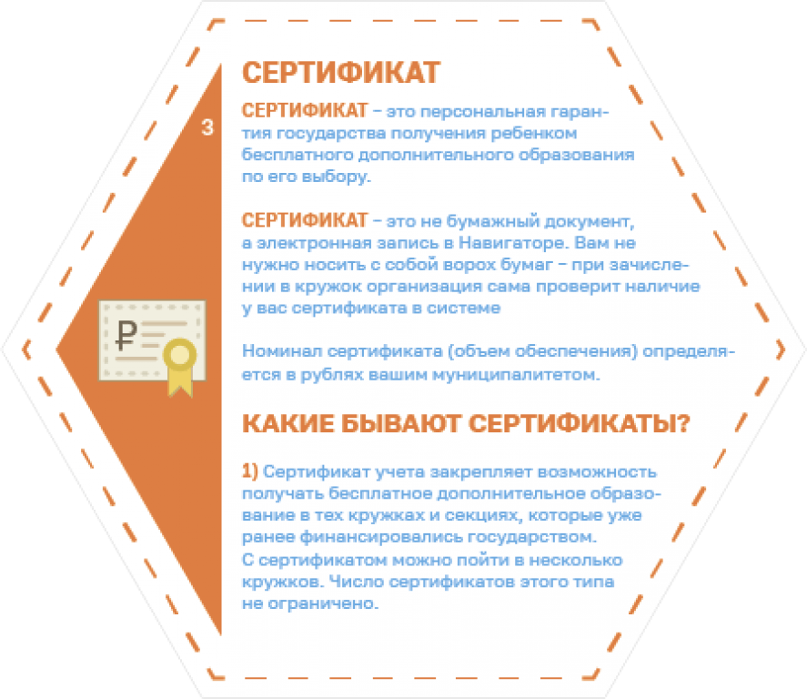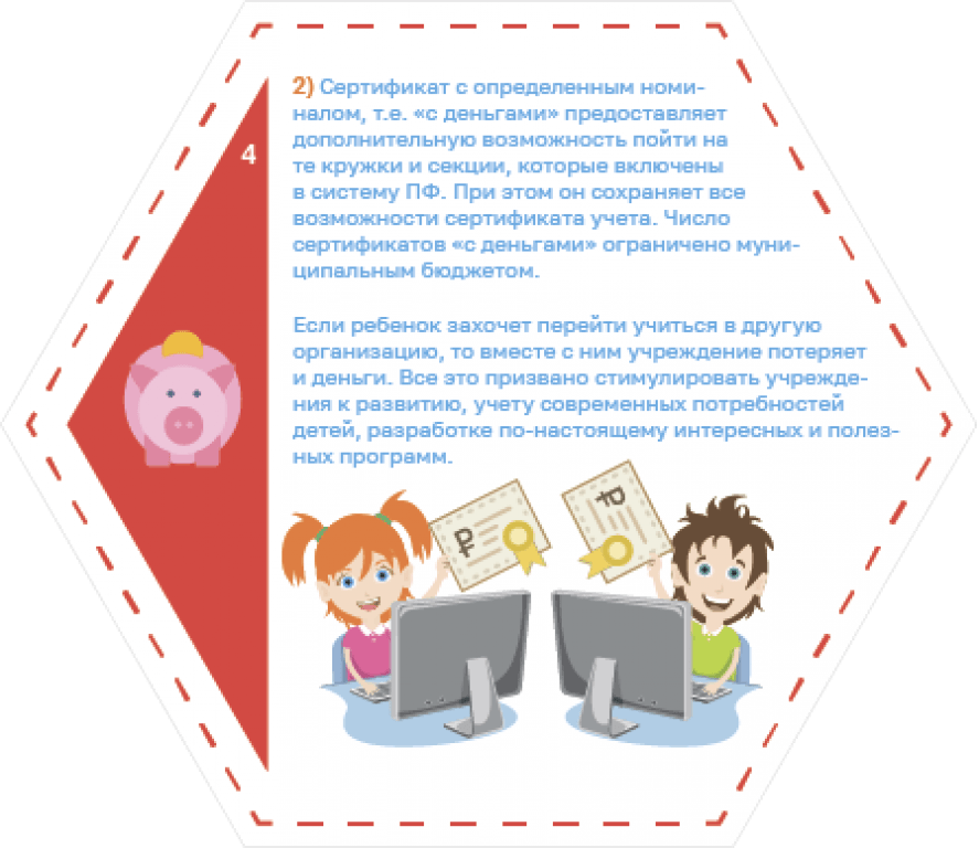 Сертификат может получить любой ребенок в возрасте от 5 до 18 лет. Сначала это просто электронная учетная запись, с сертификатом ребенок записывается на любые программы, как и раньше. Если же родитель хочет, чтобы ребёнок посещал те кружки и секции, которые переведены на механизм персонифицированного финансирования, в том числе и в частных организациях, то он пишет заявление о приёме на обучение, и на сертификат зачисляются денежные средства в пределах установленного в муниципалитете номинала сертификата.