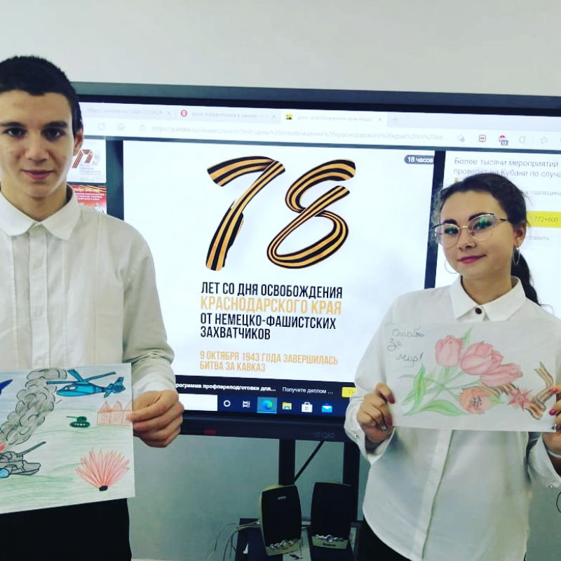Педагоги дополнительного образования рассказали учащимся о тяжёлом для всех жителей Краснодарского края периоде гитлеровской оккупации. Ребята узнали, что битва за Кавказ имела для Родины жизненно важное значение, а сама борьба с врагом приняла крайне ожесточённый характер. Победа досталась Кубани высокой ценой. Наш край направил на фронт Великой Отечественной войны более 800 тысяч кубанцев. Более 400 тысяч - не вернулись домой. 289 наших земляков стали Героями Советского союза, 62 - полными кавалерами ордена Славы.