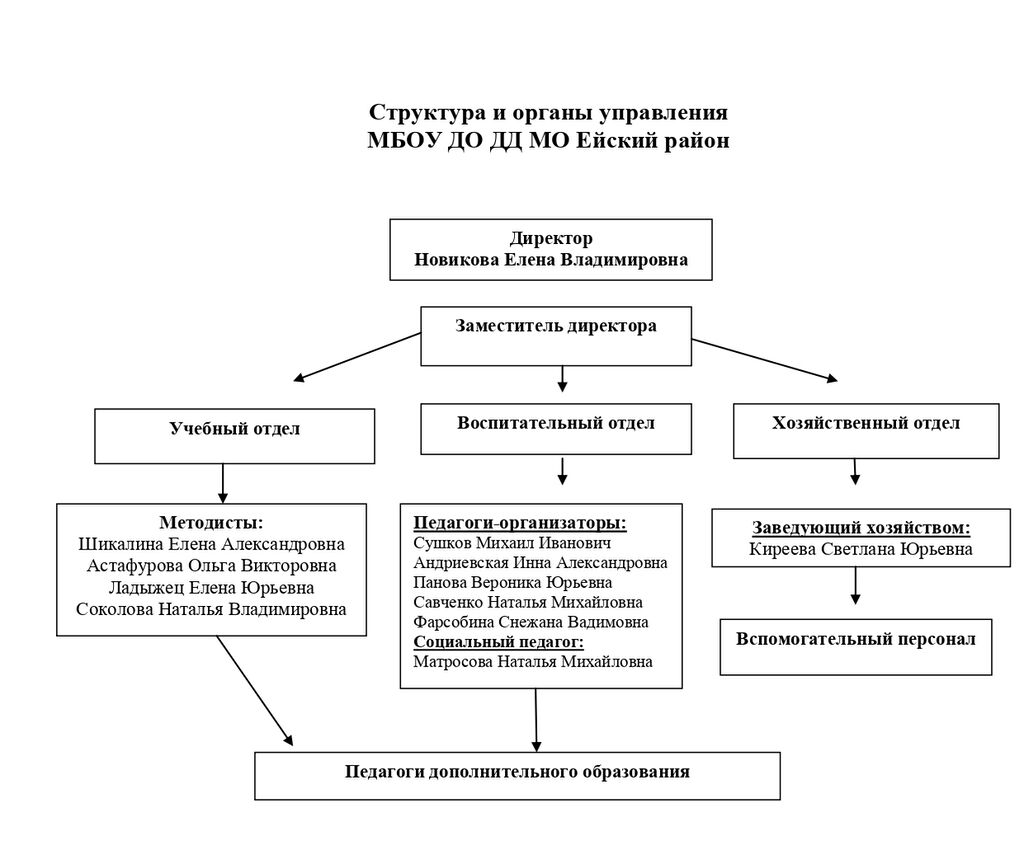 Директор МБОУ ДО ДДТ МО Ейский район - Новикова Елена Владимировна Управление Образовательным учреждением осуществляется в соответствии с Федеральным законом «Об образовании в Российской Федерации», иными законодательными актами Российской Федерации, Уставом учреждения и строится на принципах единоначалия и самоуправления, обеспечивающих государственно-общественный характер управления.